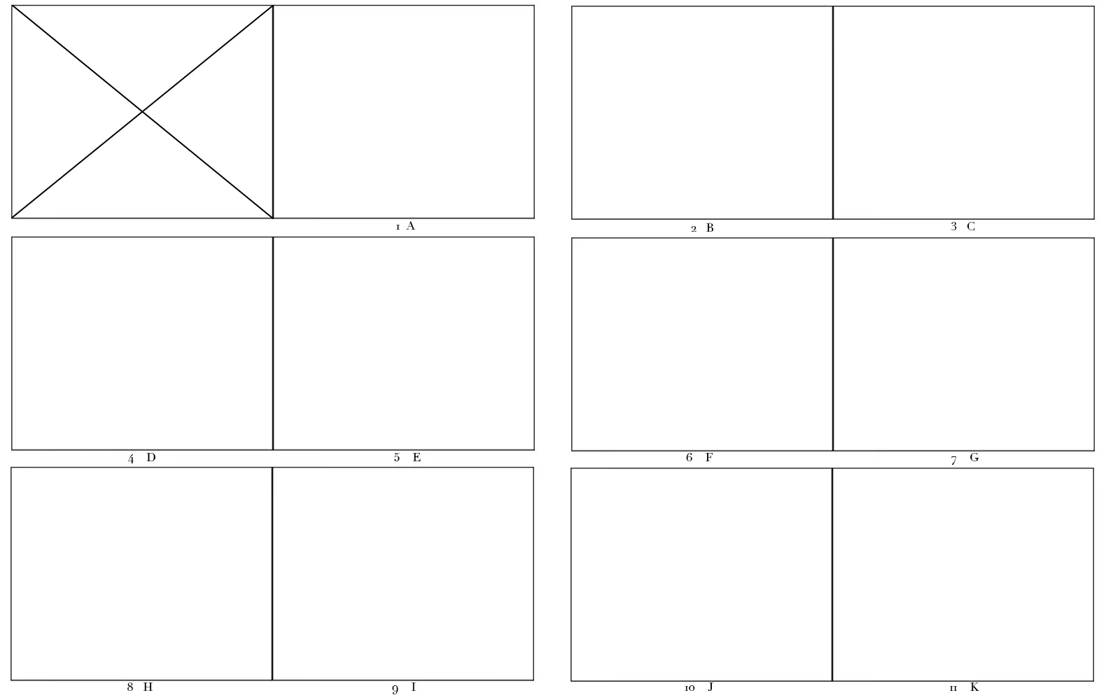 This is my own personal layout system, for a 32-page horizontal picture book. Most systems go by page numbers, but my system uses letters (A-ZF), so that when you’re creating image files on the computer, if you name the files accordingly and either look for files within a folder or go to create a PDF dummy, the computer will arrange the files in the right order.