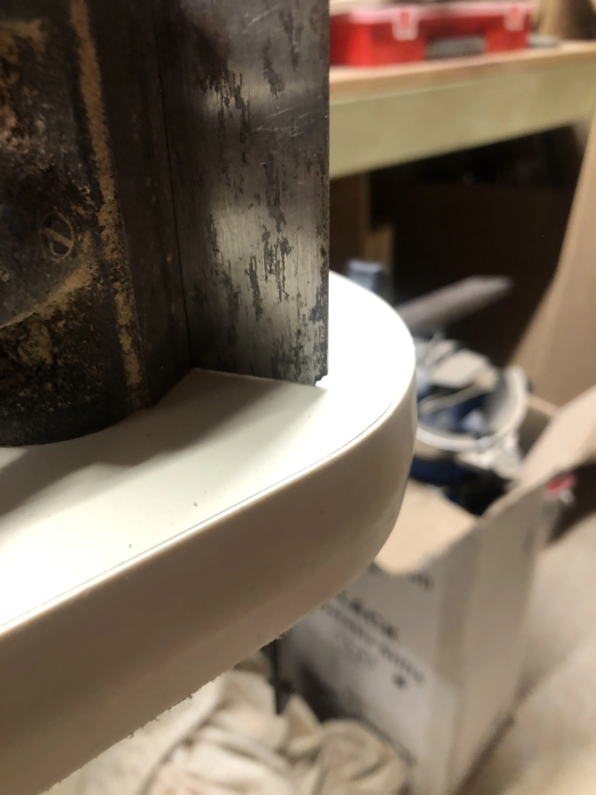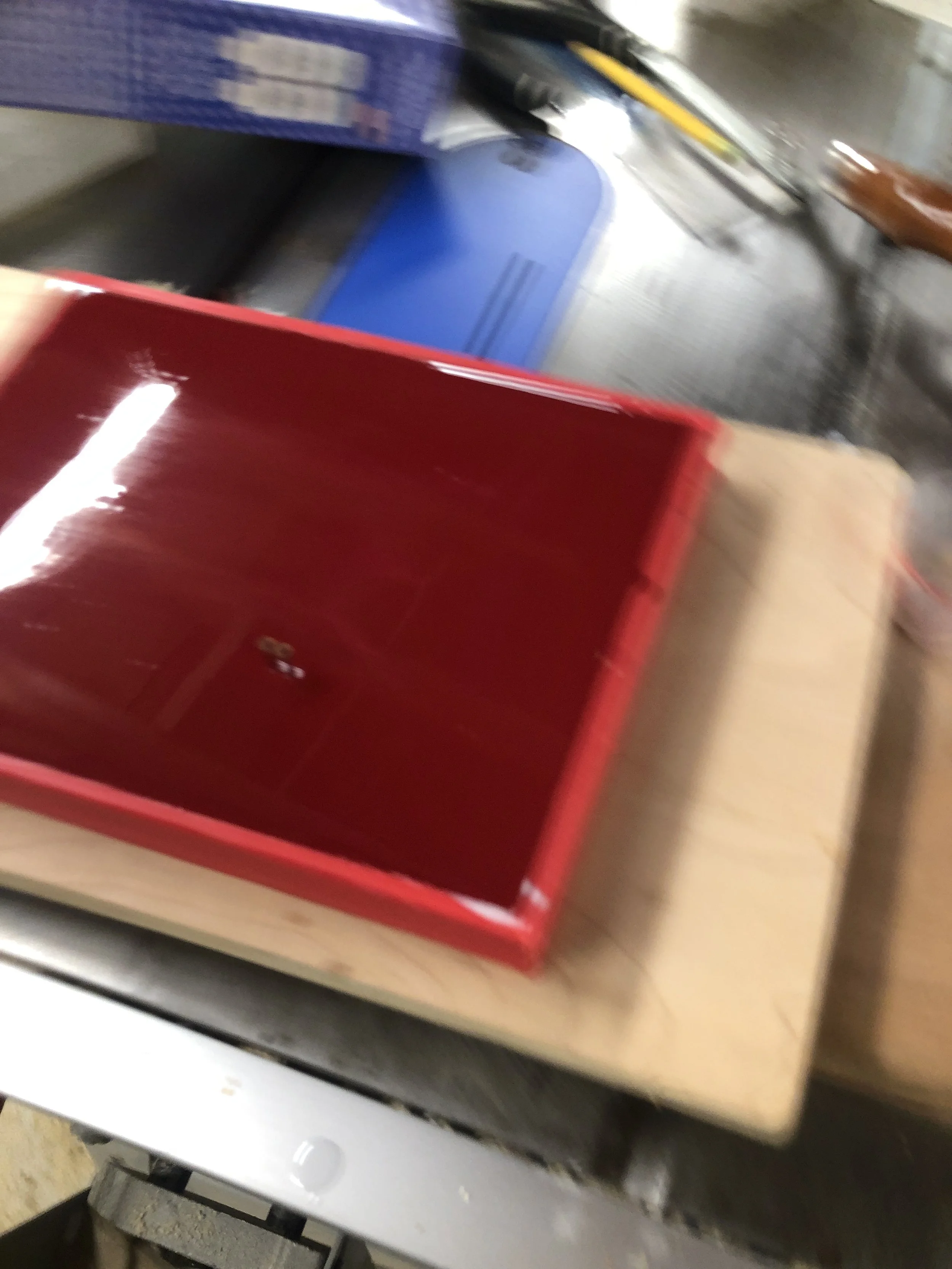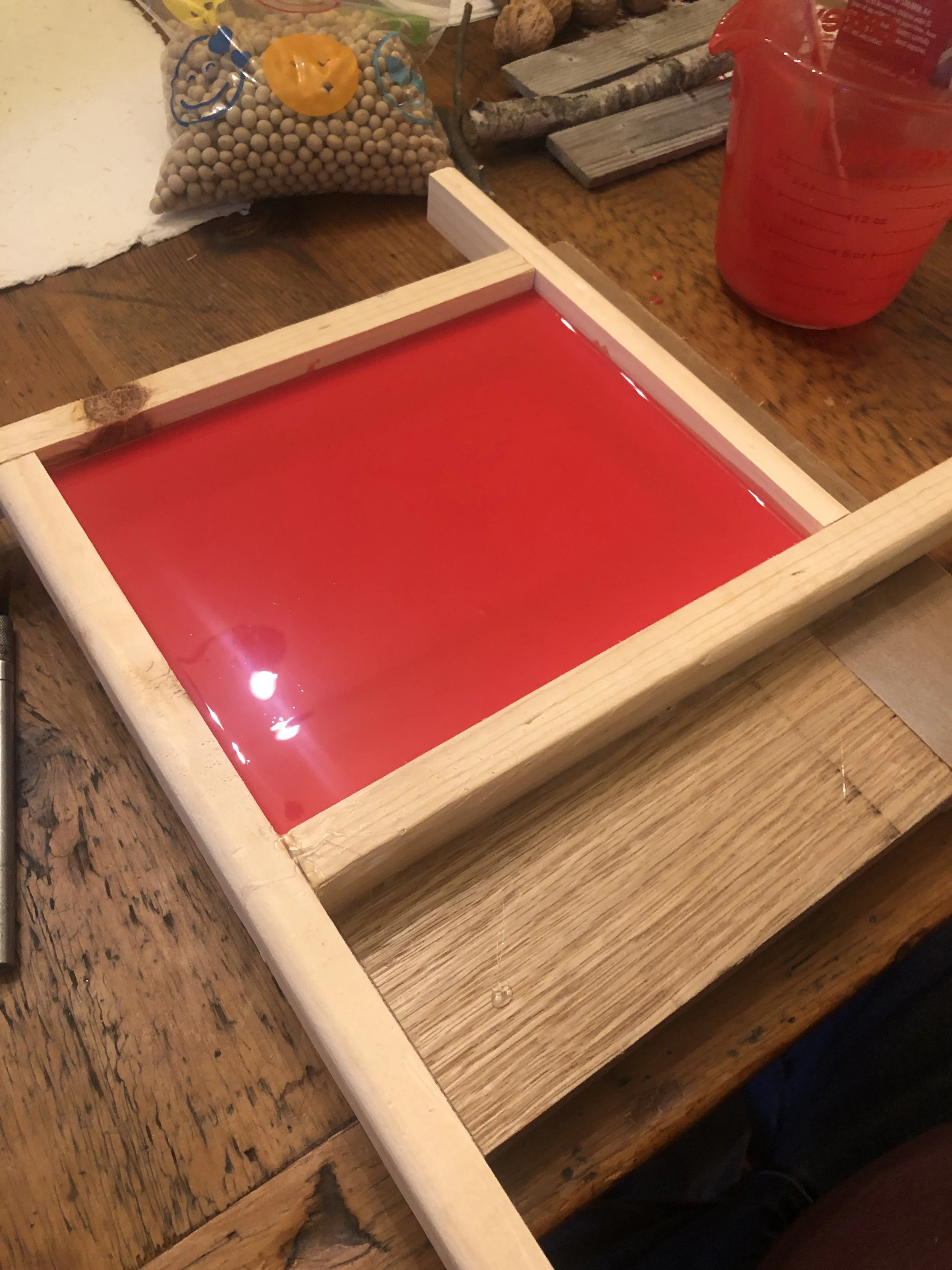 Next, it’s the actual pour. I decided to do the pour in two stages: first, fill the moulding around the door with white-colored epoxy, and once that’s set, fill the door itself with red epoxy, and a little more to lend thickness to the overall piece (terrible photo, but I was paying more attention to whether the pour was going to work than I was to documenting process).