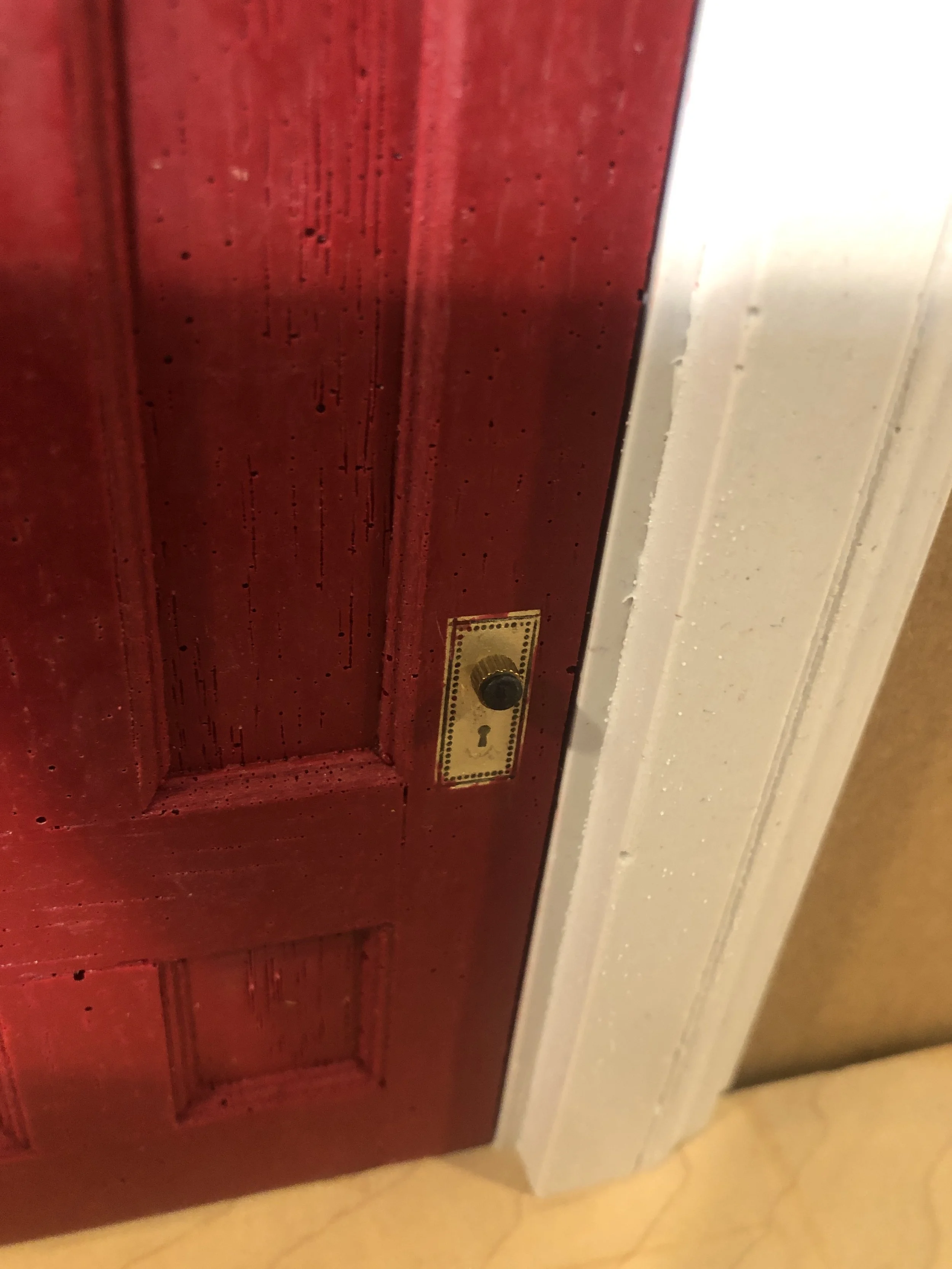 My answer was to create a silicone mold, and pour a door and frame of solid epoxy, so the colors go all the way through, and shouldn’t be so obvious if the doorway gets scratched. This allowed me to also inset a brass number plate and doorknob/doorknob plate in a way that they couldn’t easily be stolen.