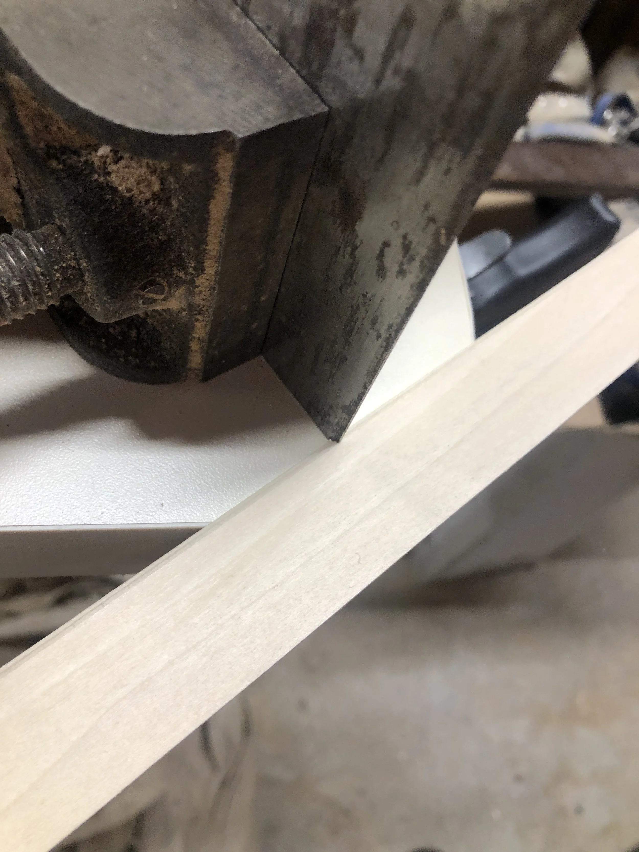 See that tiny little notch in the corner of that piece of steel? That’s the final contour of the little moulding I’m making. I pull a piece of wood against it again, and again, and again (see below)…