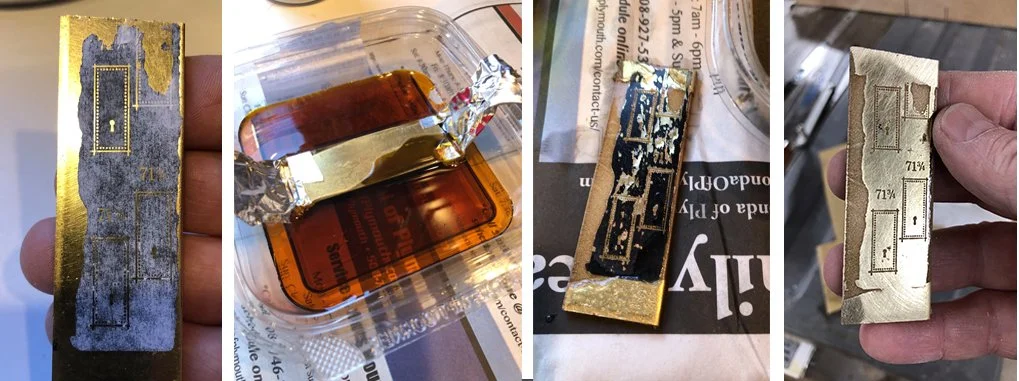 Below, I’ve taken a laser-printed image—with toner density set to its highest—and ironed it onto a piece of brass stock. Then—GENTLY—washed away the paper, leaving a mask of toner on the brass (left). Then the brass gets suspended upside down in ferric chloride until I’m satisfied with my etch. The third photo shows the brass AFTER etching, and it looks like a real mess. It’s only after a lot of polishing on fine sandpaper that you see the etch detail come out (right.)