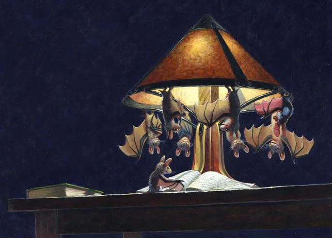 The creator of “Bats at the Beach” has brought his endearing band of flying mammals back for a nocturnal visit to the public library, a stimulating trip made possible by news that a window to the building has been left ajar. The older members of the group — you can tell them by their spectacles — are content with seeking out favorite titles such as “Goodnight Sun.” Some bats, in “munchy moods,” will study “guides to fancy foods.” Others — quite literally — “hang out” by the lamps to schmooze, while a few of the youngsters play shape shadows with an overhead projector. Brian Lies clearly has a passion for libraries and the world of wondrous treats that they have to offer, an enthusiasm he shares by way of his wonderfully sophisticated chiaroscuro paintings.